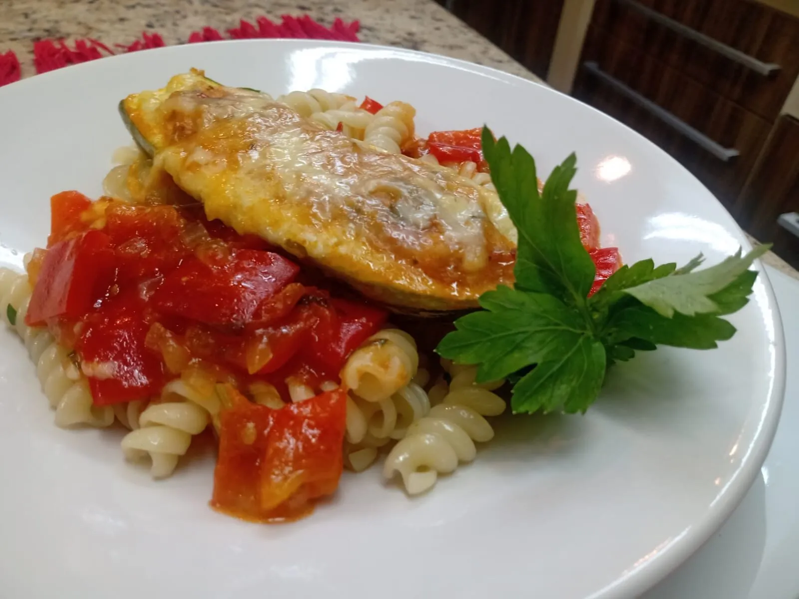 Forre a assadeira com o molho, recheie as abobrinhas, cubra com muçarela e leve ao forno para gratinar.