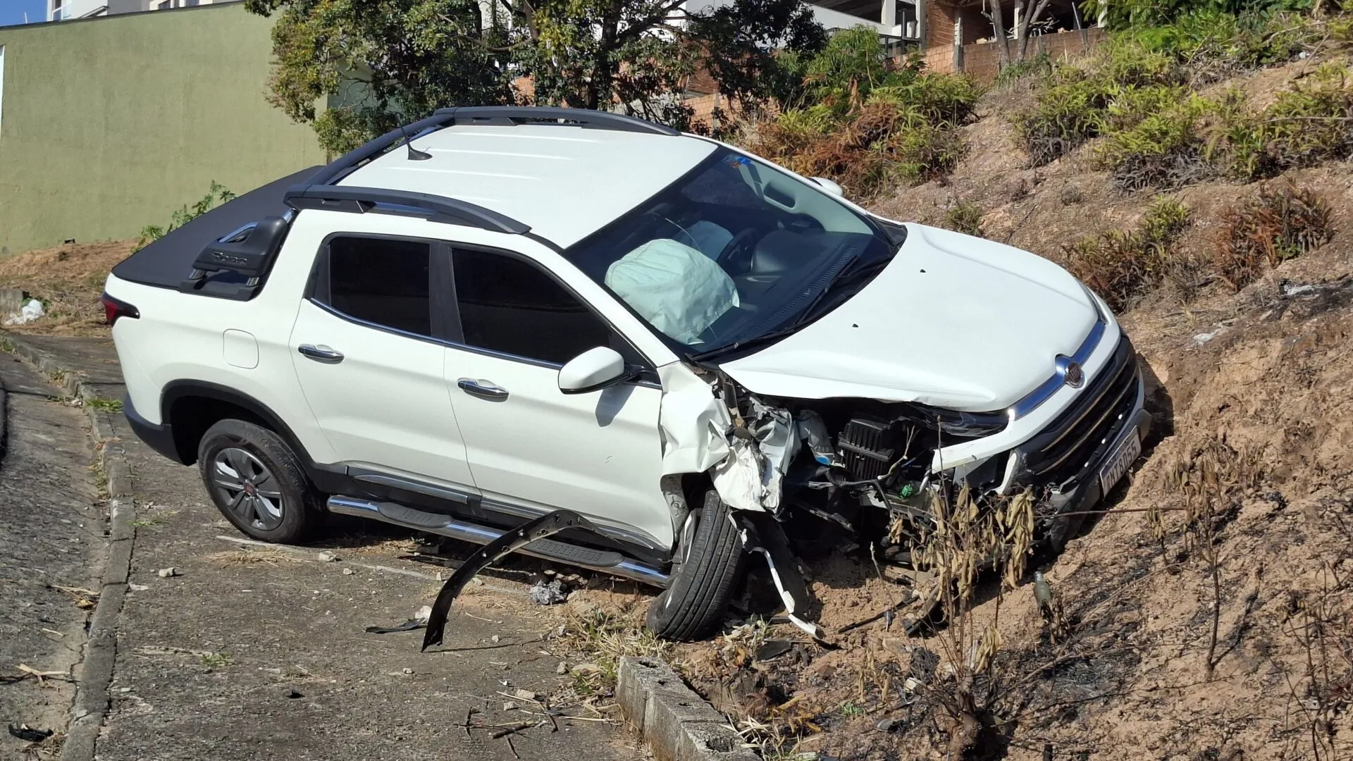 Imagens mostram o momento em que uma Fiat Toro atinge dois veículos durante uma descida na Rua Marcos Ebenezer Pezzi. Um dos carros acabou caindo em um barranco.