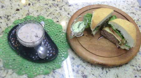 Comece defumando a berinjela de maneira simples. Basta colocar em uma frigideira seca sobre o fogo e ir virando vez ou outra até murchar e defumar. Depois é só raspara a parte interna e amassar com um garfo.