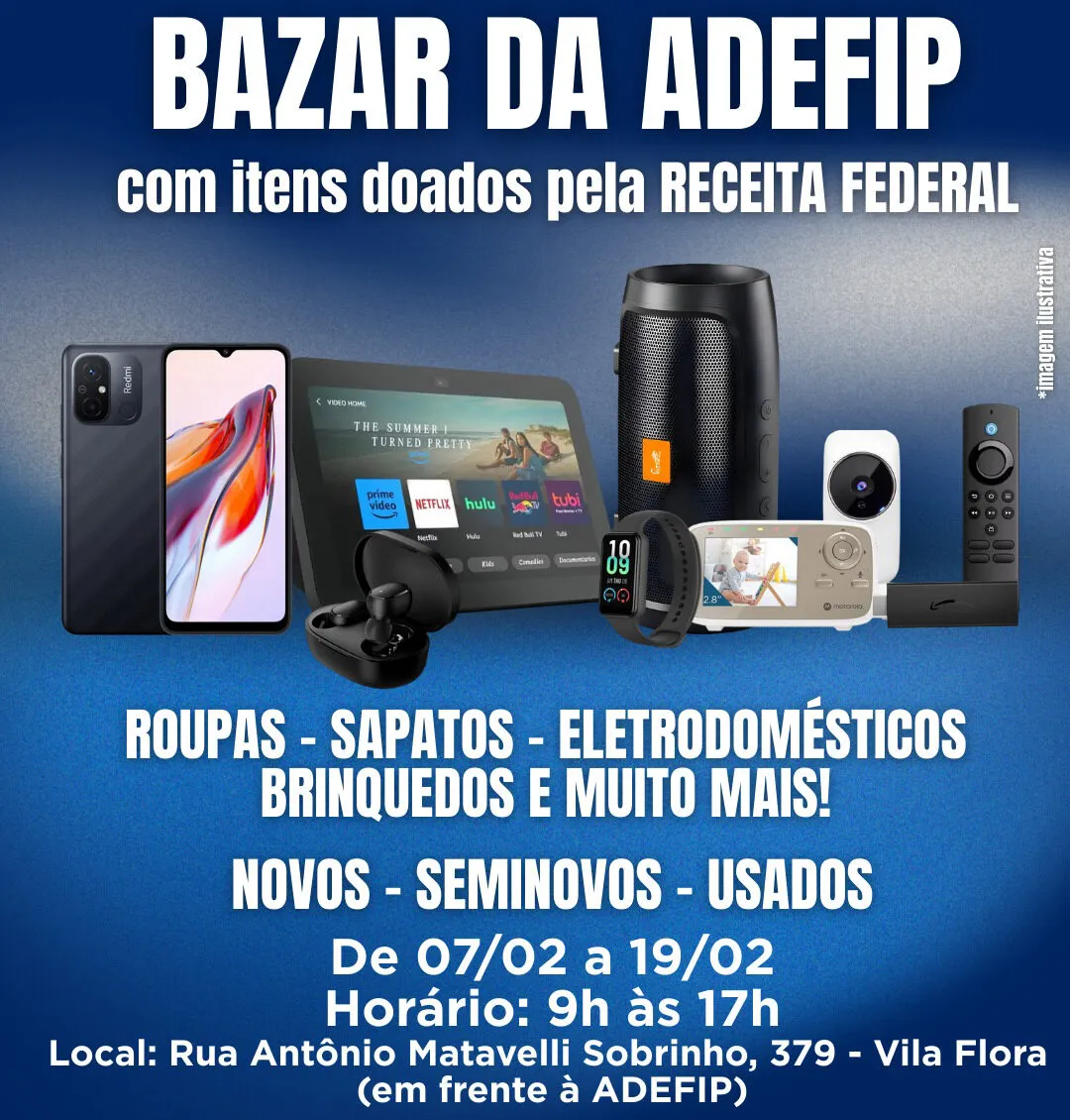 A ADEFIP promove, entre os dias 7 e 19 de fevereiro, mais uma edição do seu tradicional bazar solidário em Poços de Caldas. A ação reúne itens novos, seminovos e usados, doados pela Receita Federal, com preços acessíveis e ampla variedade de produtos.