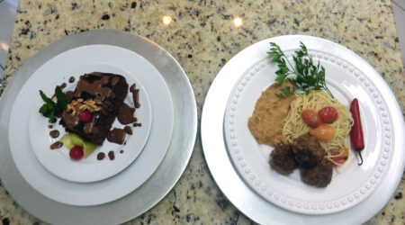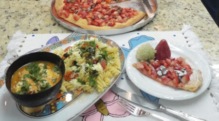 Bolinho de Arroz com Bacalhau, Pasta de Pimentão com Azeitona e Pêssego com Calda de Groselha