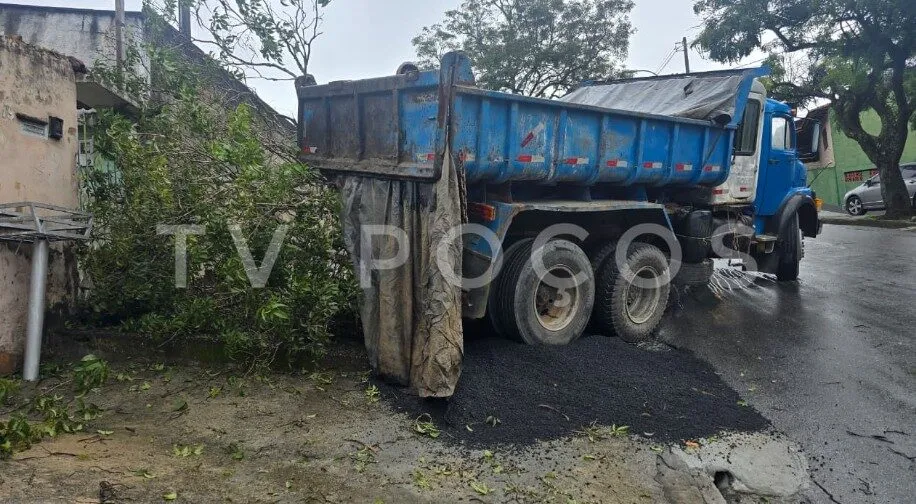 Caminhão carregado de asfalto derrapa e bate em árvore na zona leste de Poços