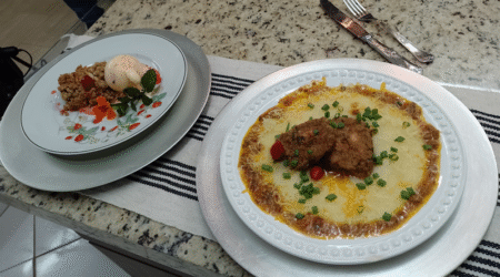 Caponata de berinjela & Bolinhas de queijo & Torta de avelã com azeite