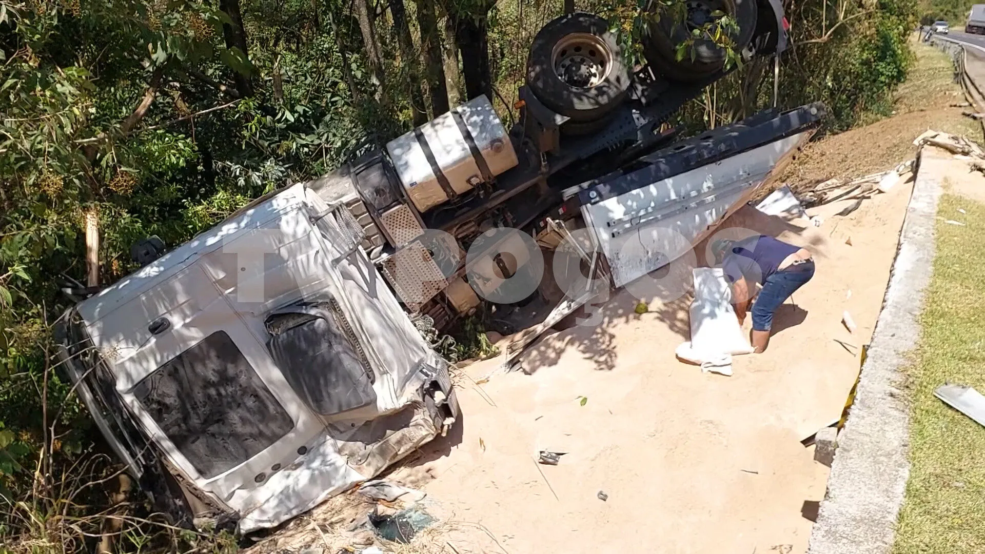 O acidente ocorreu por volta das 4h, quando o veículo tombou e parte da carga ficou espalhada pelas margens da rodovia. O motorista, de 49 anos, saiu ileso.