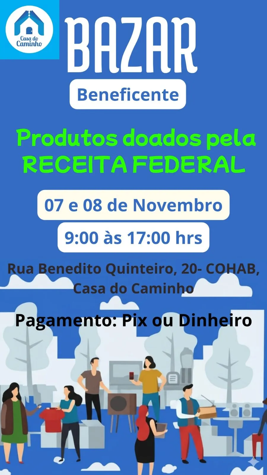 A Casa do Caminho promove nesta sexta e sábado, dias 7 e 8 de novembro, a partir das 9h, um bazar beneficente com produtos doados pela Receita Federal. O evento acontece na sede da instituição, localizada na Rua Benedito Quinteiro, nº 20, bairro Conjunto Habitacional, em Poços de Caldas.