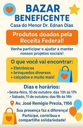 A Casa do Menor Dr. Ednan Dias realiza nesta sexta-feira (10) e sábado (11) de outubro um bazar beneficente com produtos doados pela Receita Federal. O evento acontecerá na Avenida José Remígio Prezia, 1166, das 13h às 17h na sexta-feira e das 9h às 14h no sábado.