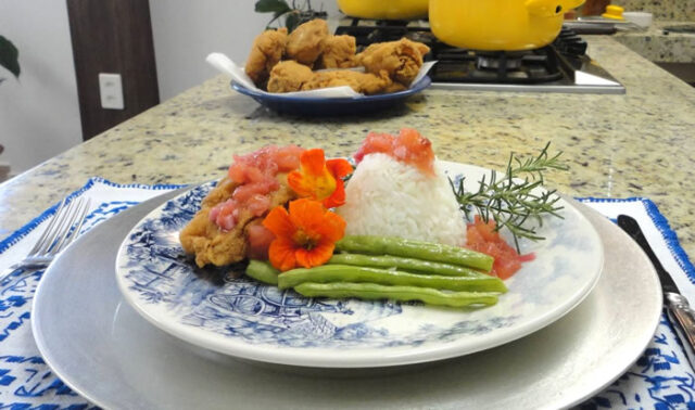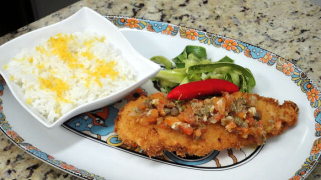INGREDIENTES do peixe 500 gr. de filé de tilápia 1 limão siciliano 1 ovo 1 xícara de chá de leite 250 gr. de panko (farinha de trigo granulada p/empanar) 1 xícara de chá de farinha de trigo Sal a gosto e óleo pra fritar INGREDIENTES do molho 1 tomate grande picado 1 colher de sopa de alho picado ½ colher...