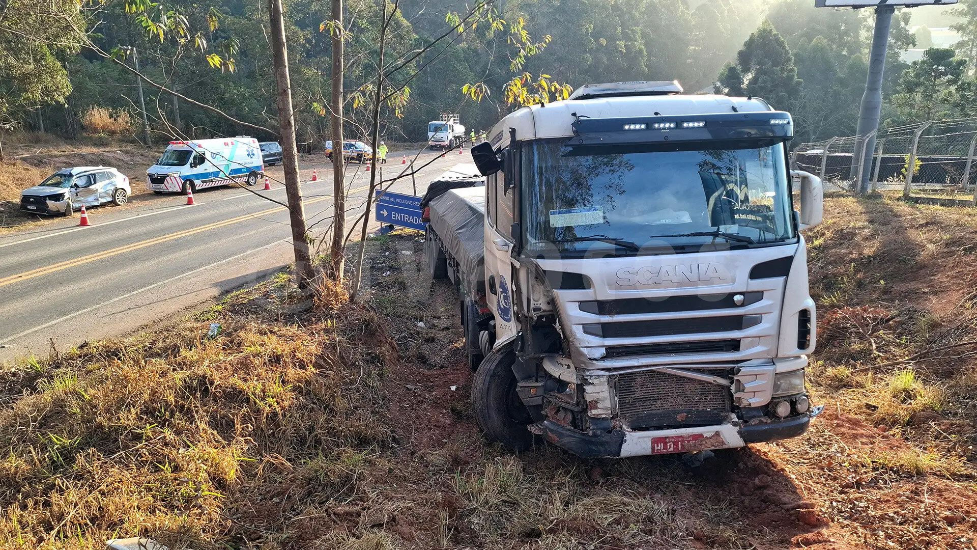 Um acidente envolvendo um carro Toyota Corolla Cross e uma carreta foi registrado na tarde deste domingo (27), na LMG-877, Rodovia do Contorno, na altura do km 5, em frente a um hotel, em Poços de Caldas.