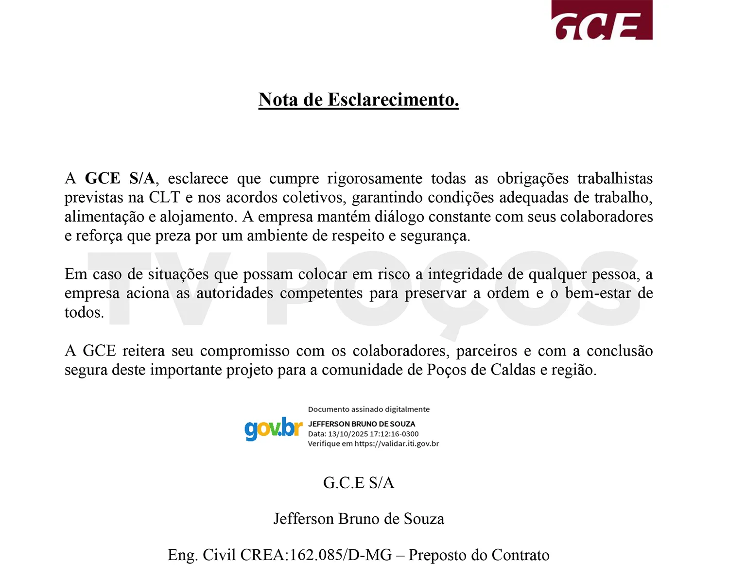 Em nota oficial, assinada pelo engenheiro Jefferson Bruno de Souza, a GCE S/A afirmou que cumpre rigorosamente todas as obrigações trabalhistas previstas na CLT e em acordos coletivos, oferecendo condições adequadas de trabalho, alimentação e alojamento. A empresa destacou que mantém diálogo constante com os colaboradores e aciona autoridades competentes sempre que necessário, preservando a segurança e o bem-estar de todos.