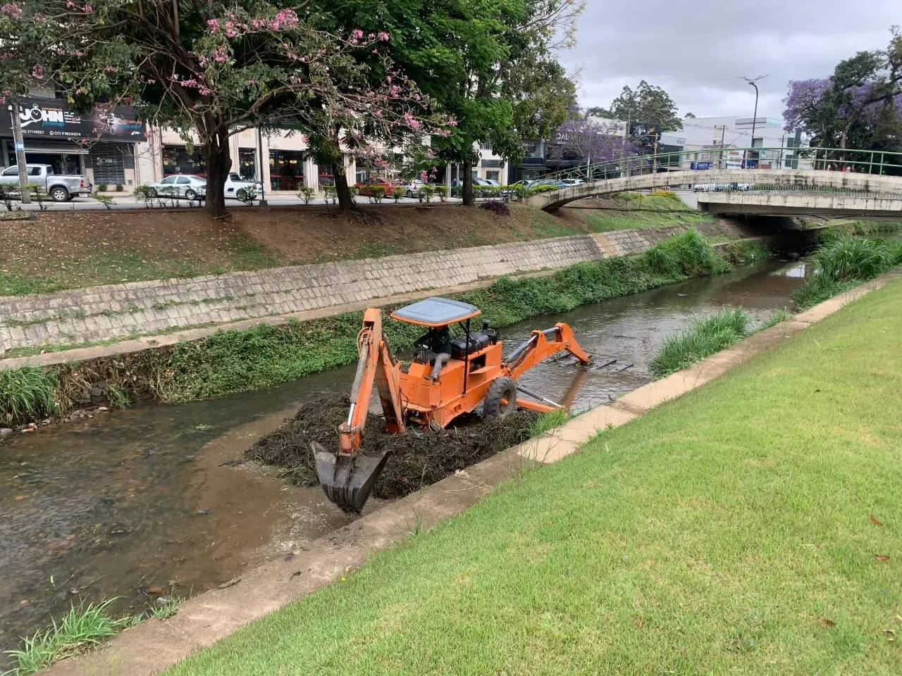 Desassoreamento do Ribeirão Poços de Caldas, aumentando a capacidade de vazão e prevenindo transbordamentos;