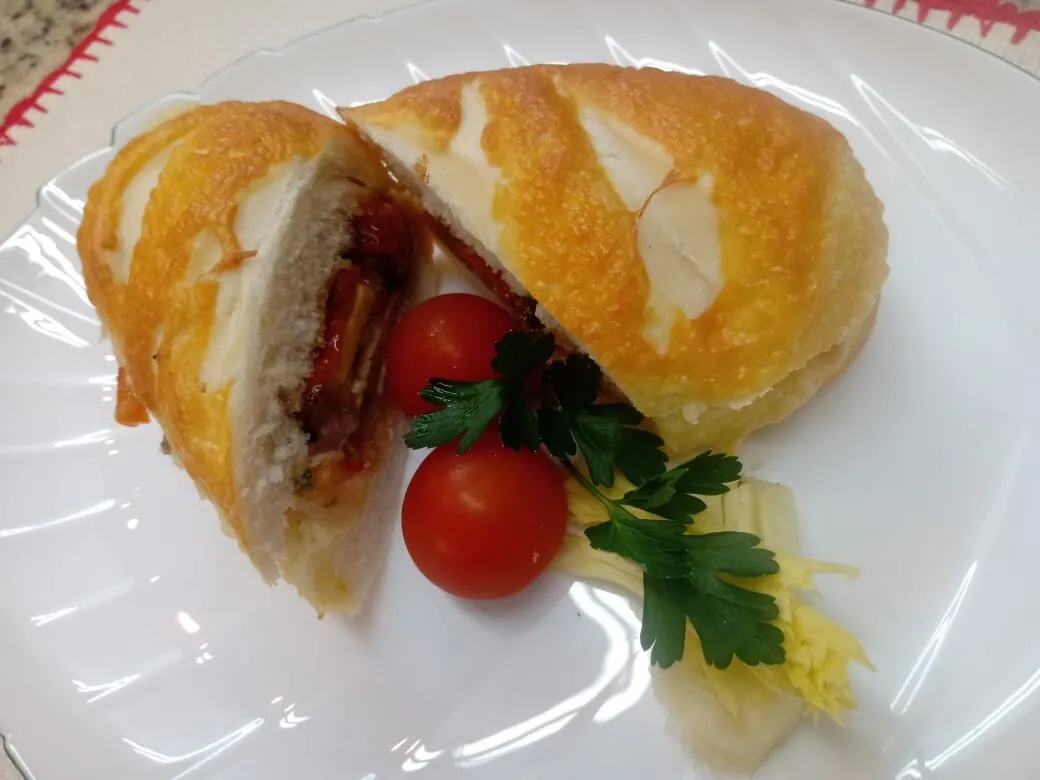 Monte o sanduíche no pão de sua preferência, acrescente o lagarto, o molho e fatias de tomate seco. Sirva frio.