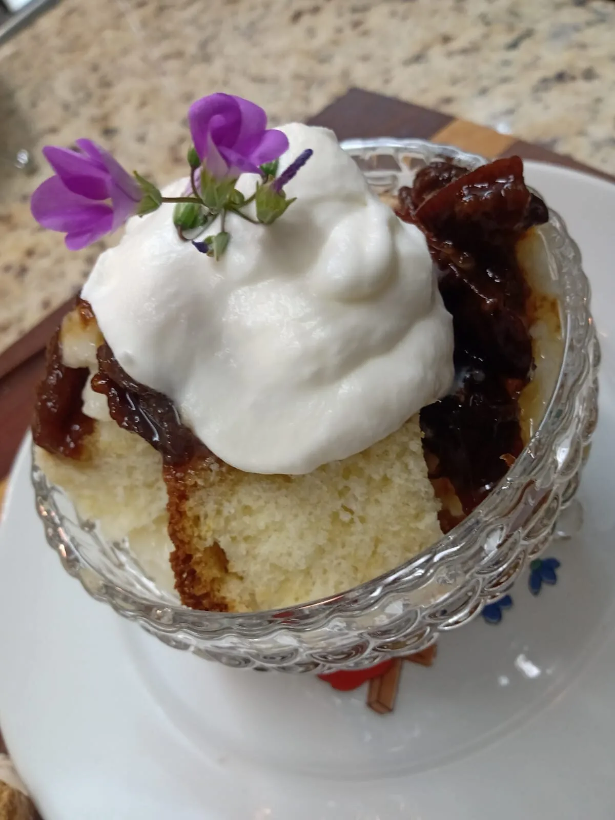 Preparo: o bolo é assado em assadeira de bolo inglês e, depois de pronto, servido em taças individuais intercalando pedaços da massa com o creme de abacaxi e finalizado com a calda de ameixa.