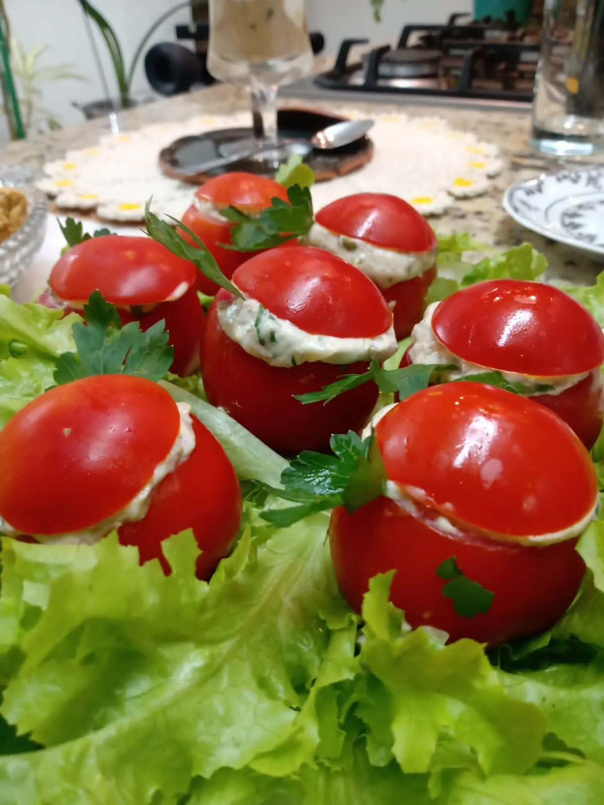 - Recheie os tomatinhos com a mistura e sirva gelado, decorando a bandeja com folhas de alface e ramos de salsinha.
