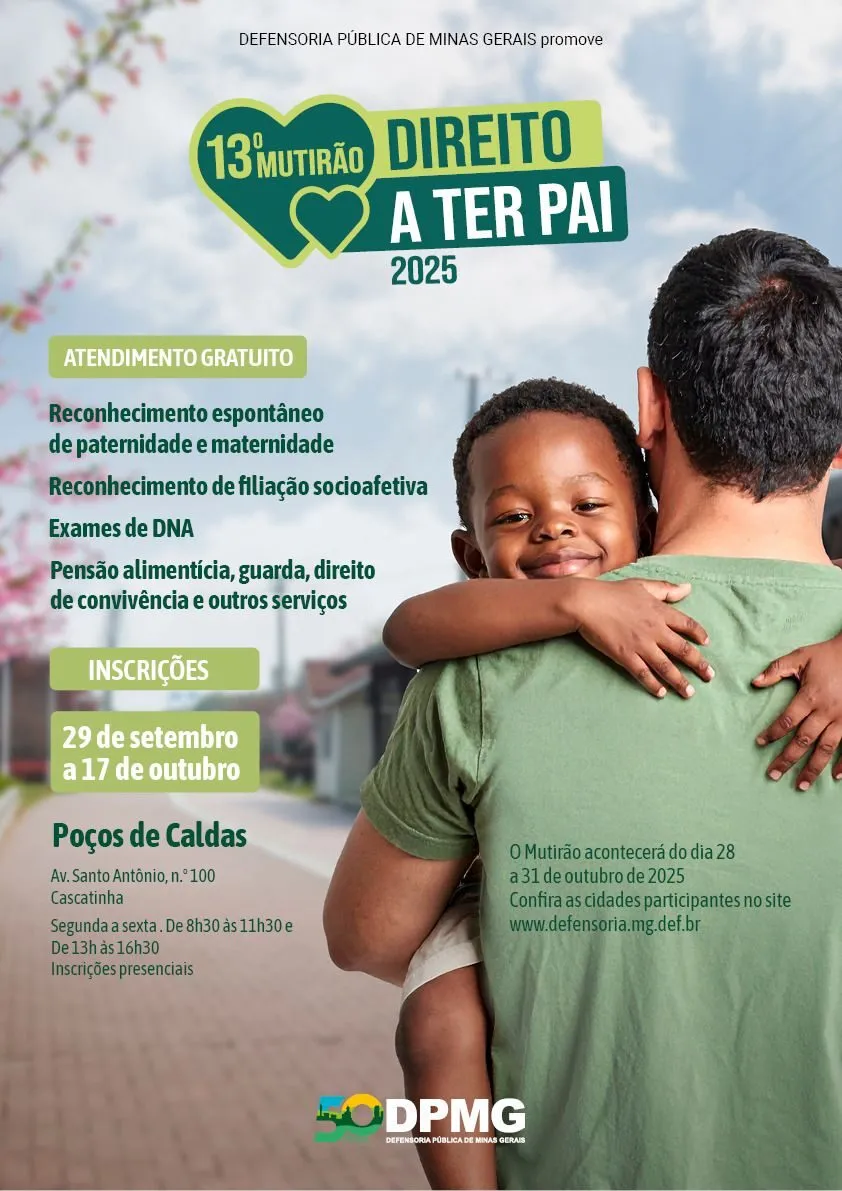A Defensoria Pública de Minas Gerais (DPMG) realizará, entre os dias 28 e 31 de outubro de 2025, o 13º Mutirão Direito a Ter Pai, iniciativa anual que busca garantir o direito à paternidade e maternidade, além de fortalecer a estrutura familiar.