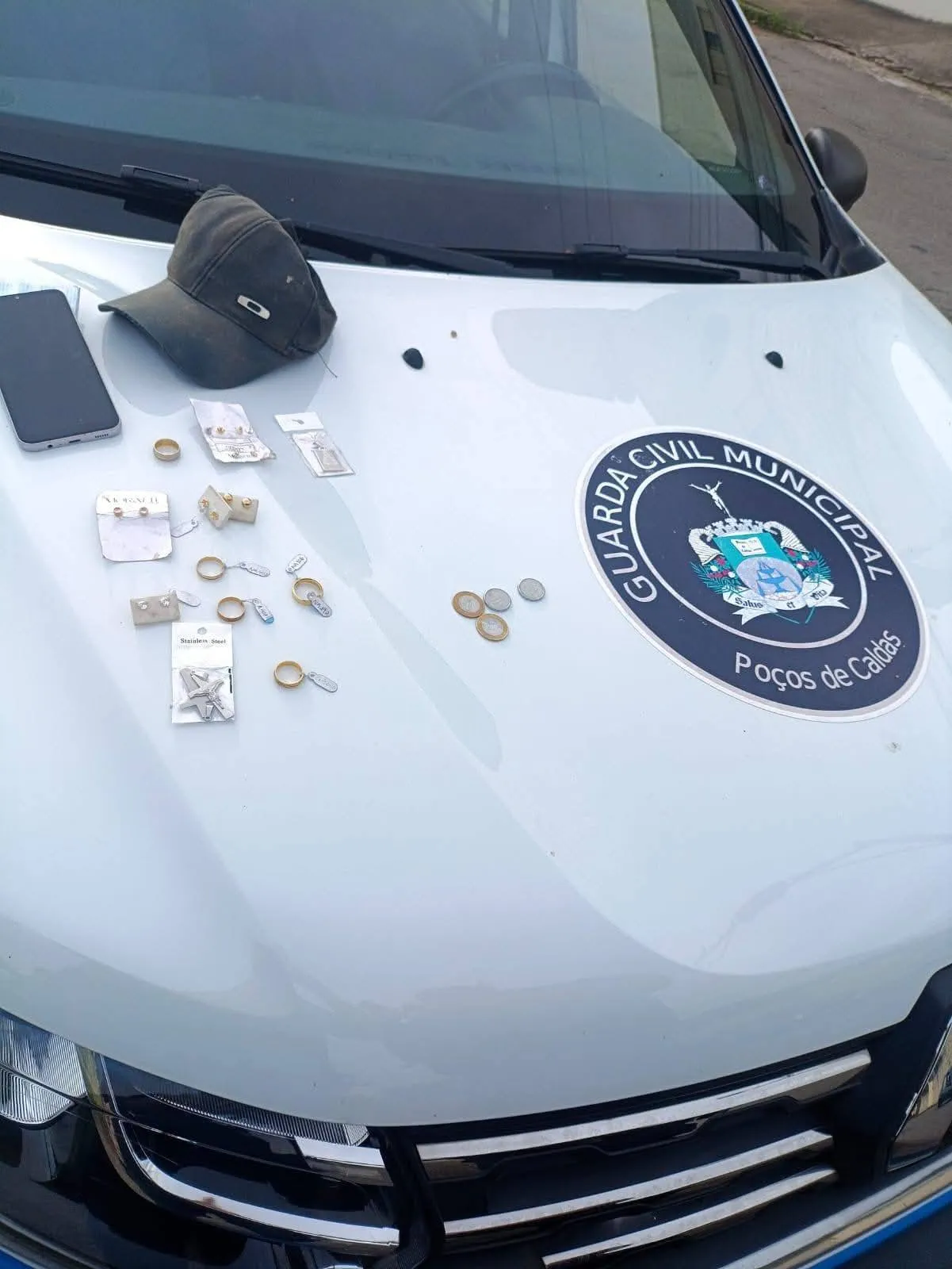 Os abordados foram identificados pelas iniciais A.V.L., T.A.S. e I.S.R. Durante busca pessoal em A.V.L., foram encontrados cinco pares de brincos, cinco alianças, três pingentes, R$ 503 em dinheiro e um aparelho celular da marca Samsung.