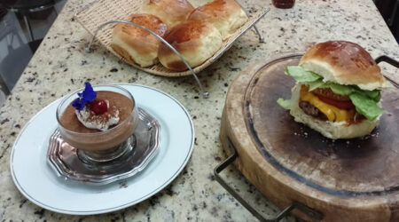Espetinho de pernil com pimentão & Bolinho de arroz com salame & Bolo lanche de coco com abacaxi