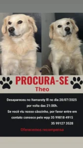 Quem tiver qualquer informação sobre o paradeiro do cão pode entrar em contato pelos telefones (35) 99818-4915 ou (35) 99127-3528. A família oferece recompensa a quem ajudar a localizar Theo.