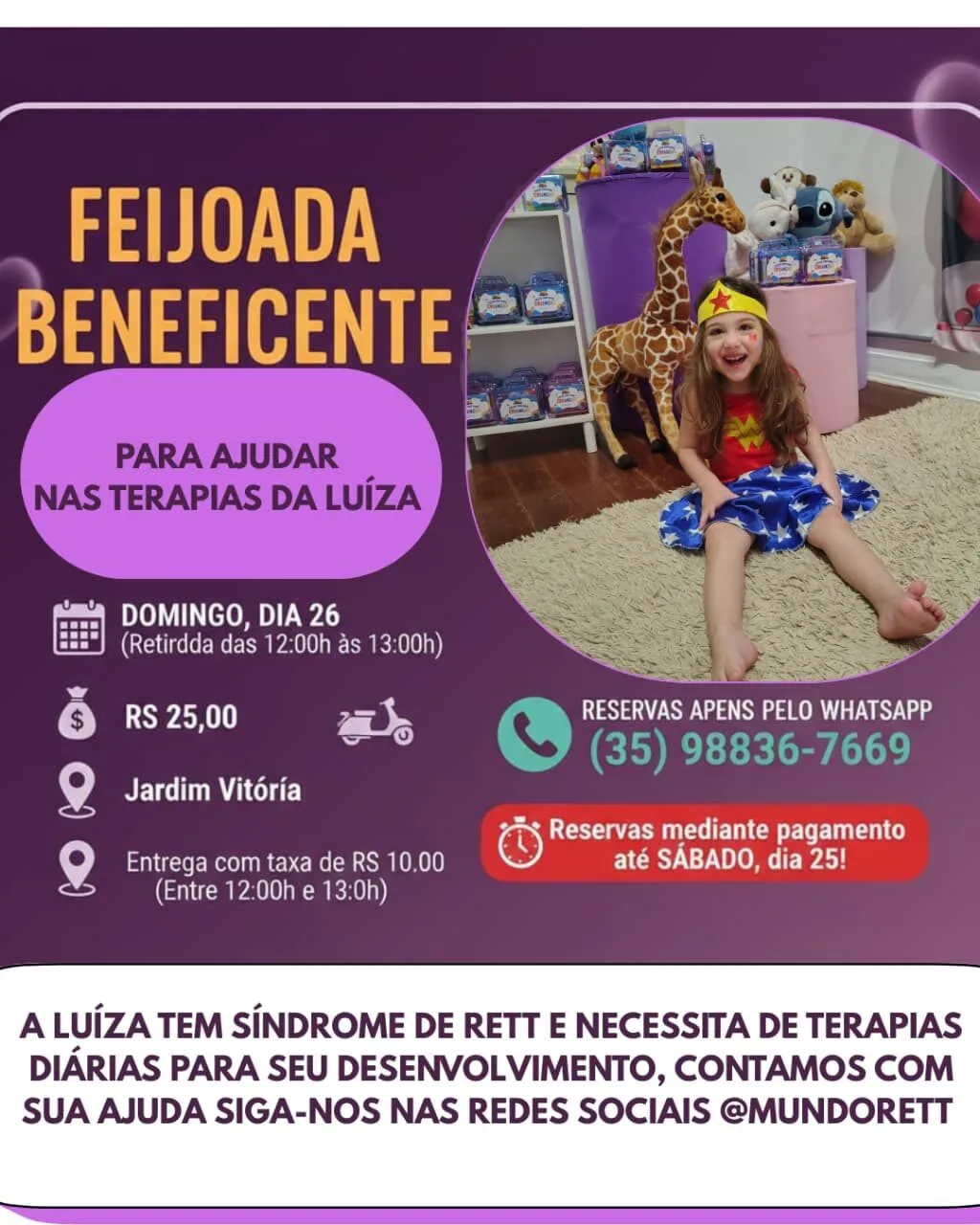A família da pequena Luíza, de apenas 3 anos, realiza neste domingo, dia 26 de outubro, uma feijoada beneficente no bairro Jardim Vitória, em Poços de Caldas. O evento tem como objetivo arrecadar recursos para custear as terapias essenciais para o desenvolvimento da menina, diagnosticada com síndrome de Rett, uma condição neurológica rara que afeta quase exclusivamente meninas.