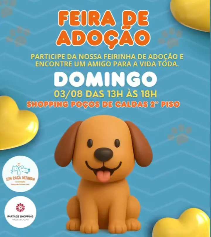 Neste domingo, dia 03 de agosto, o Shopping Poços de Caldas recebe uma feira de adoção de cães promovida pela associação Sem Raça Definida. O evento acontece no segundo piso do shopping, das 13h às 18h, e é uma ótima oportunidade para quem deseja dar um novo lar a um animal resgatado.