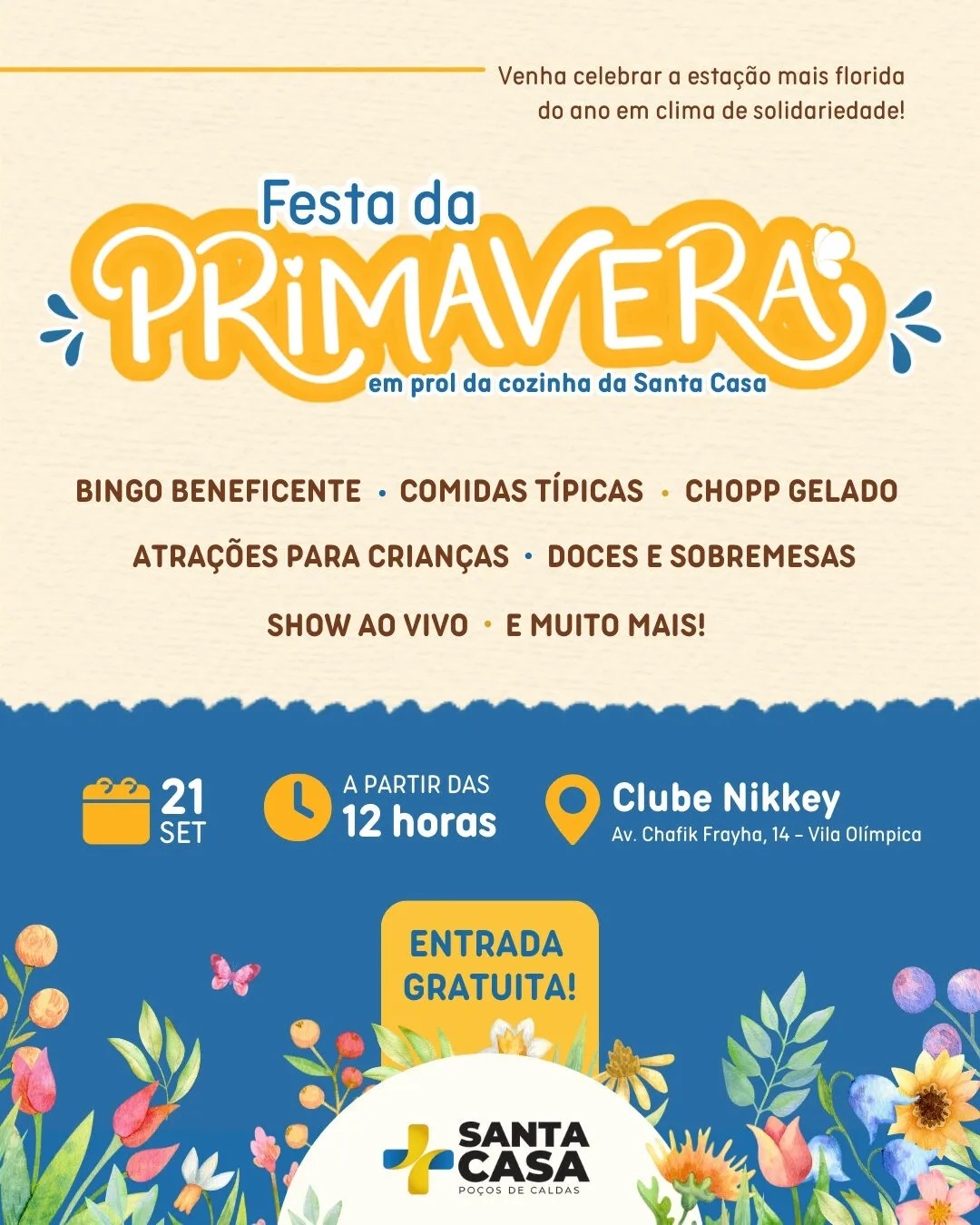 Neste domingo, dia 21 de setembro, a Santa Casa de Poços de Caldas e a Associação Voluntários Amigos da Santa Casa (SOS Santa Casa) promovem a Festa da Primavera, um evento beneficente em prol da cozinha do hospital. A celebração acontece a partir das 12h, no Clube Nikkey (Av. Chafik Frayha, 14 – Vila Olímpica), atrás do estádio Ronaldão, com entrada gratuita.