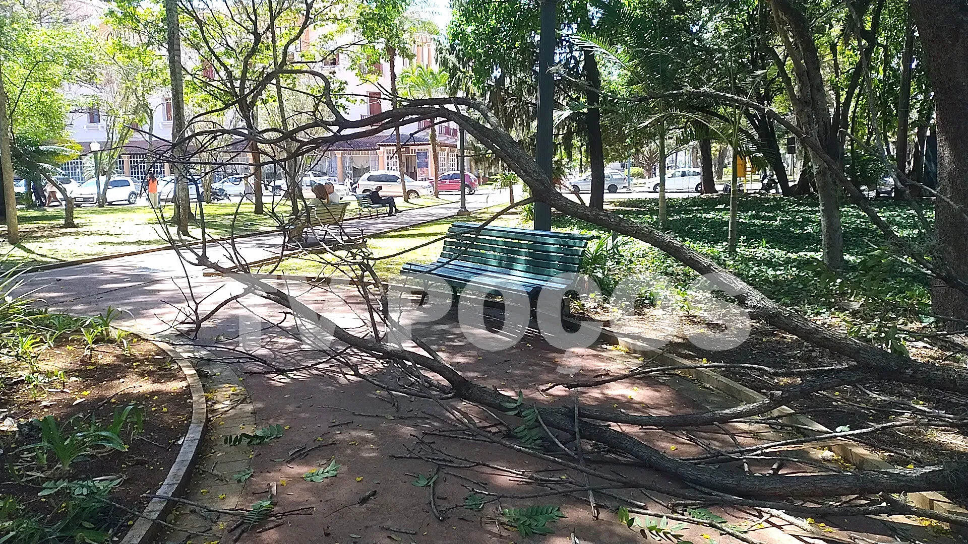 Na manhã deste sábado (27/09), um galho caiu no Parque José Affonso Junqueira, em Poços de Caldas. Felizmente, não havia pessoas no local, nem em um dos bancos próximos, no momento do incidente.