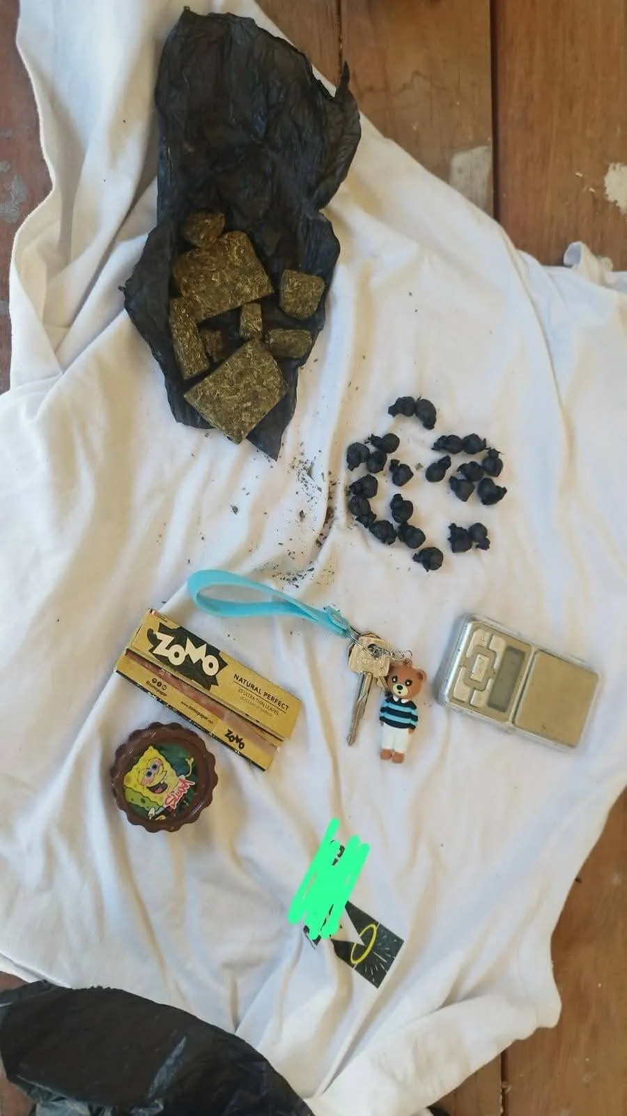 Durante a verificação da área onde os suspeitos estavam, os agentes localizaram, embaixo de uma árvore, uma bolsa preta contendo: