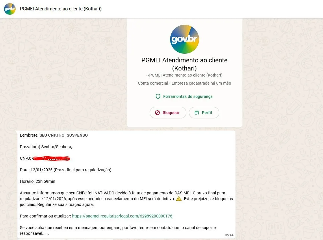 Microempreendedores Individuais (MEIs) têm sido alvo de um novo golpe que circula principalmente pelo WhatsApp no início de 2026. As mensagens informam, de forma falsa, que o CNPJ do empreendedor teria sido suspenso ou cancelado por falta de pagamento do Documento de Arrecadação do Simples Nacional (DAS).