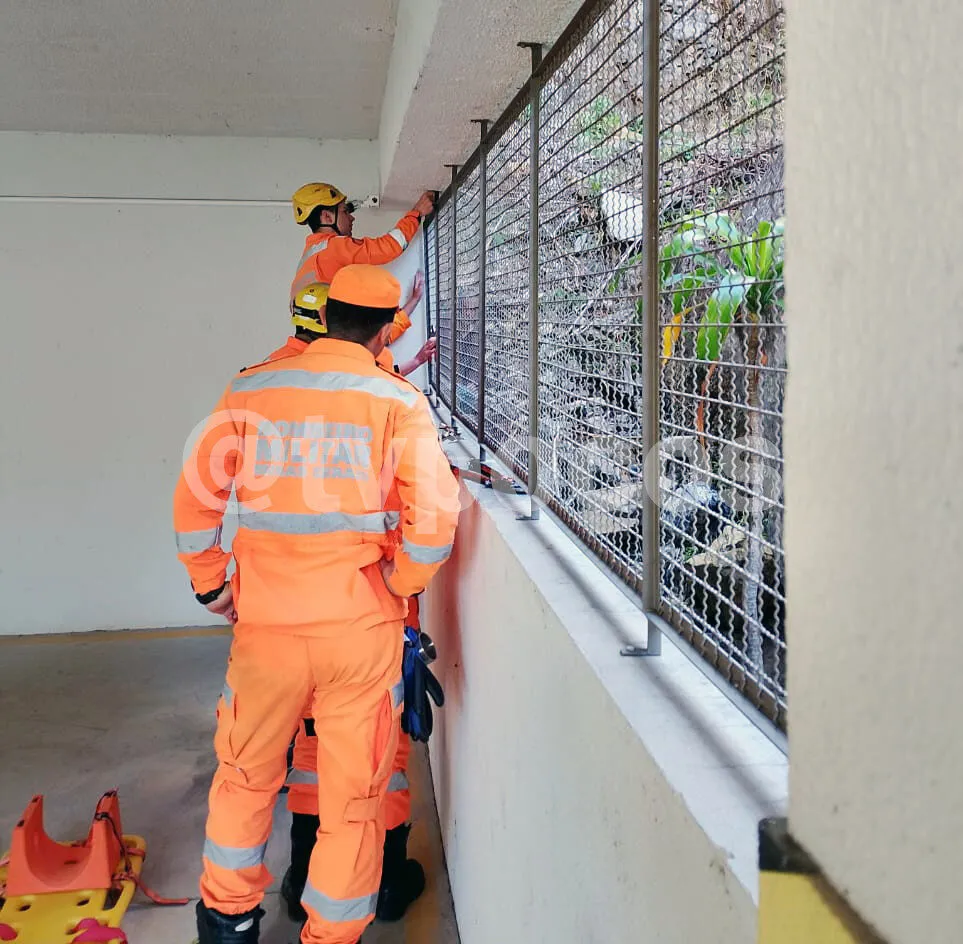 Para acessar o local, os bombeiros precisaram remover uma grade que dificultava o acesso ao ponto onde o homem estava caído.