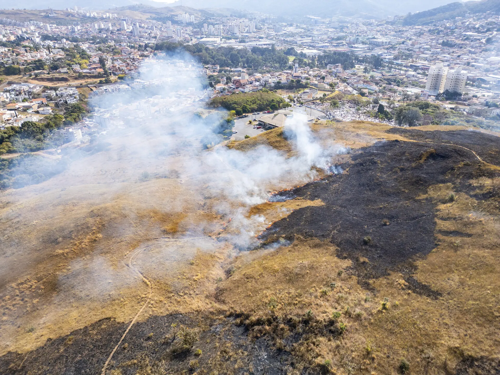 Incêndio atinge vegetação próxima ao Cemitério da Saudade em Poços