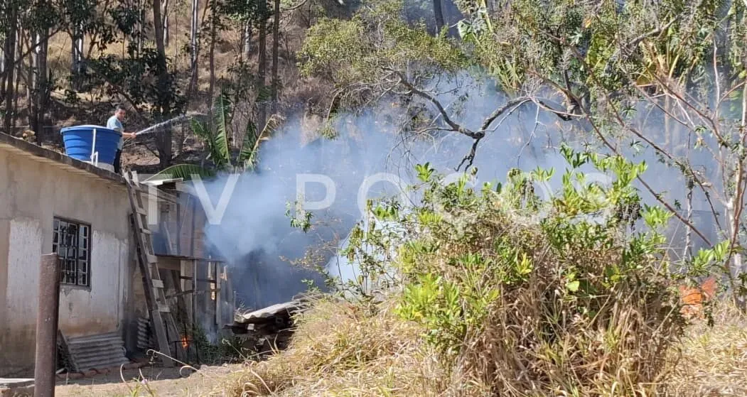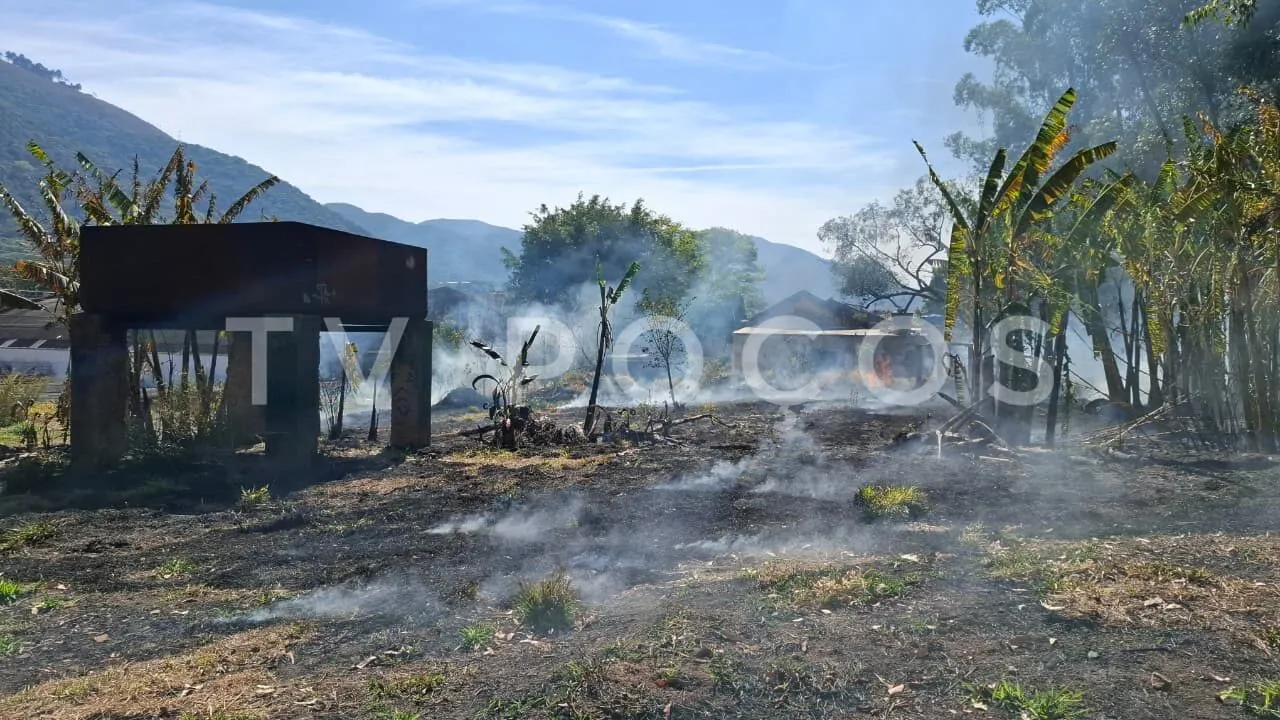 Um incêndio em uma área de mata na manhã desta sexta-feira, 12, quase atingiu residências na Rua Beira Linha, no bairro Campo da Mogiana, zona oeste de Poços de Caldas.