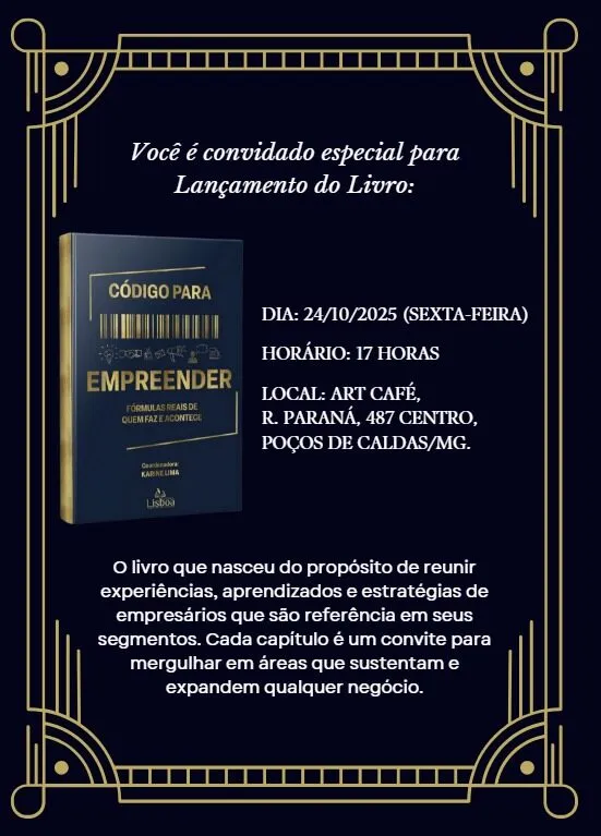 O Art Café, em Poços de Caldas, recebe na próxima sexta-feira, 24 de outubro de 2025, às 17h, o lançamento do livro “Código para Empreender – Fórmulas Reais de Quem Faz e Acontece”, organizado por Karine Lima e publicado pela Editora Lisboa.