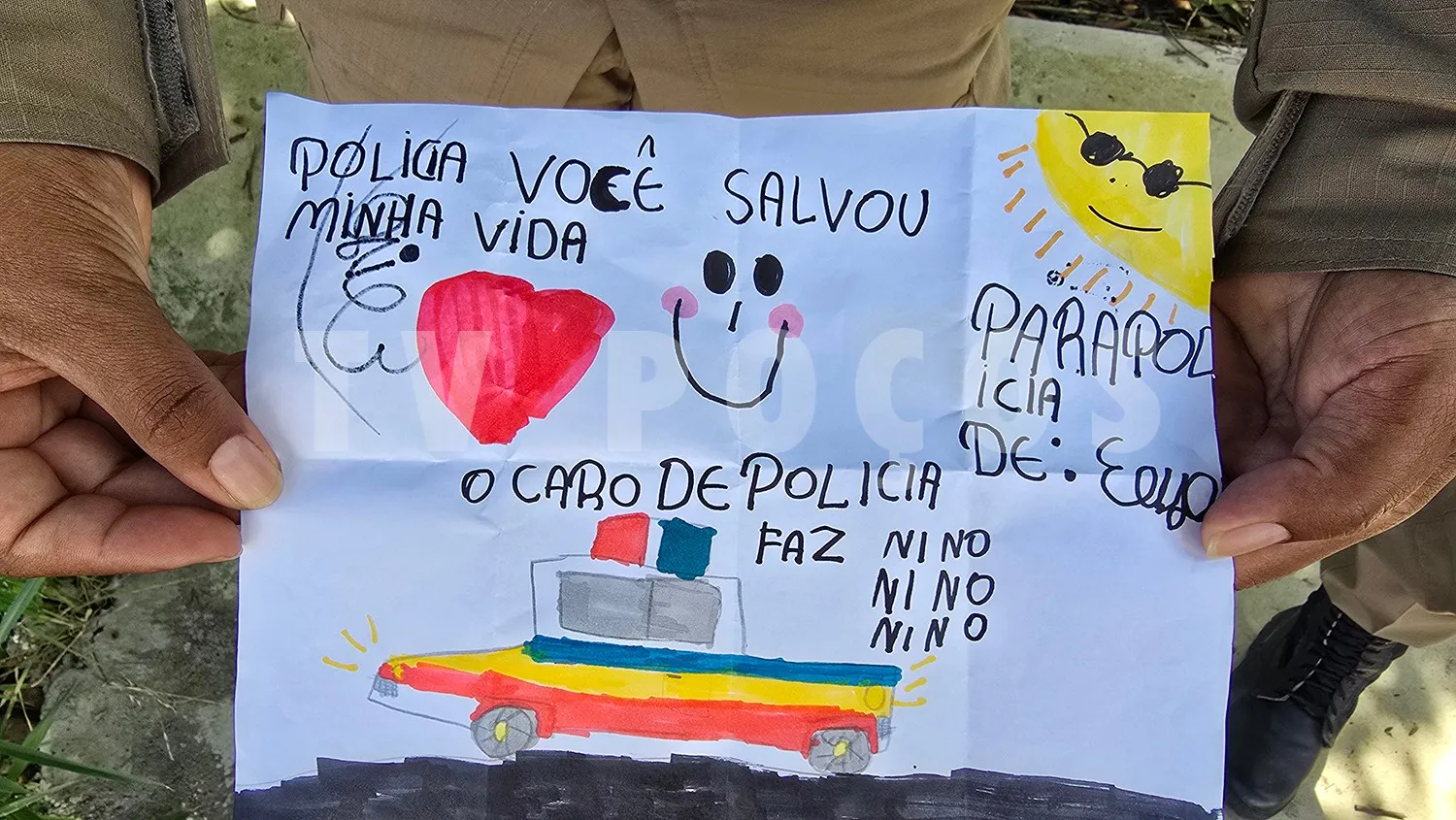 Moradora da região, a pequena Elisa, de 6 anos, ao avistar a viatura da Polícia Militar, aproximou-se acompanhada da avó e surpreendeu os policiais ao entregar uma carta acompanhada de um desenho. Na mensagem, a menina revelou um sonho simples e cheio de significado: um dia se tornar policial.