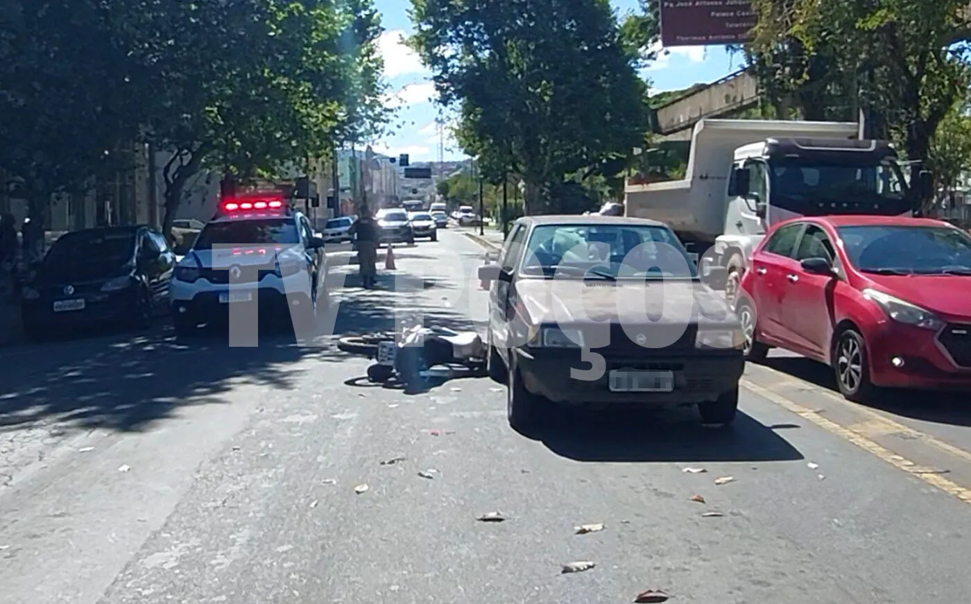 Motociclista fica ferido em acidente no centro de Poços