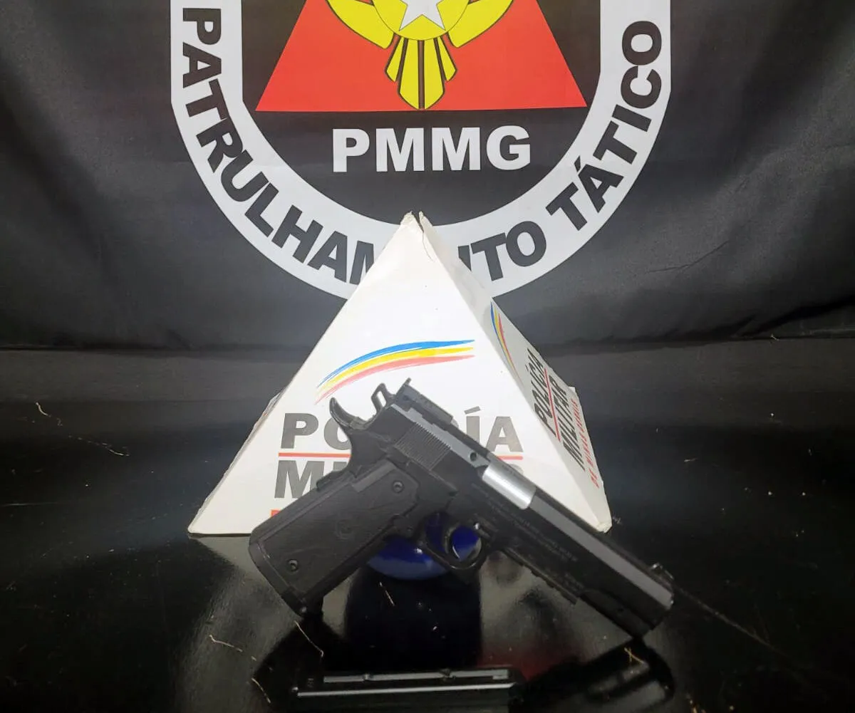 Durante a abordagem, os militares encontraram na cintura do autor a arma utilizada no crime, identificada como uma pistola de airsoft calibre 6mm. A motocicleta usada na ação também foi apreendida.
