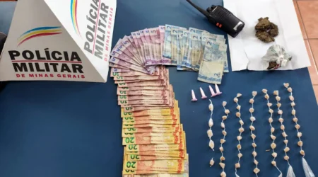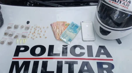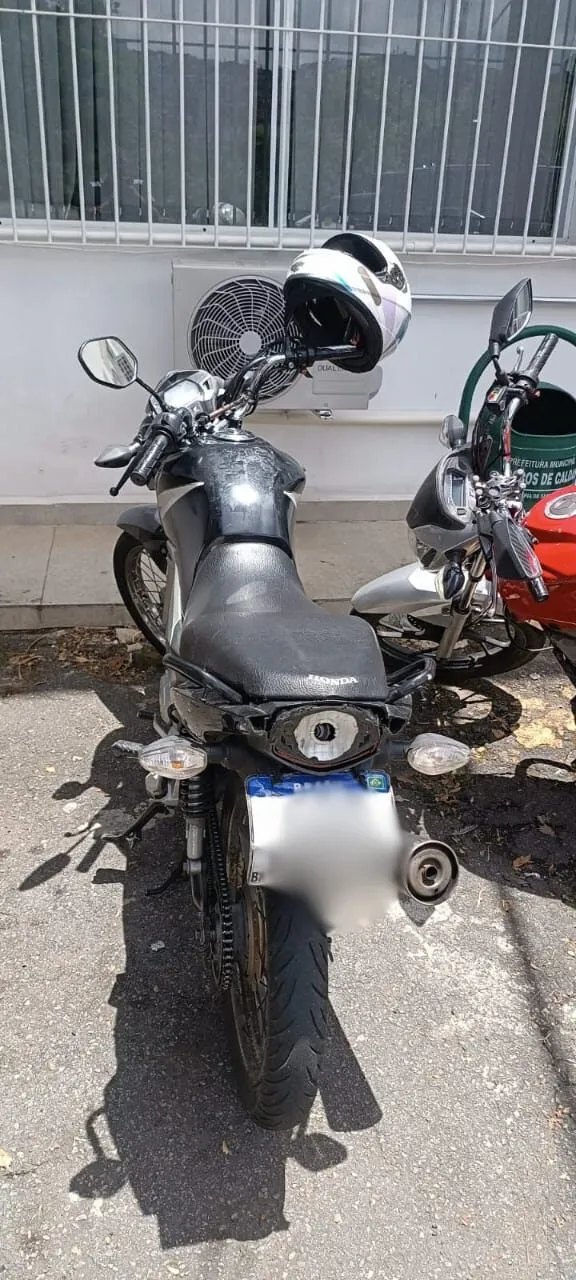 Ao chegar à residência do suspeito, as equipes localizaram uma motocicleta Honda CG Titan 160 preta com placa, chassi e número de motor adulterados. A perícia confirmou que o veículo havia sido furtado no Estado de São Paulo. No imóvel também foram encontradas porções de cocaína, haxixe e uma balança de precisão.