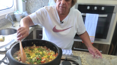 Refogue o tender em um fio de azeite, junte a cebola, salsão, pimentão, ervilha, leite de coco, em seguida misture o arroz, uva passa, tâmaras e a banana já cortada em rodelas. Leve ao forno para gratinar antes de servir.