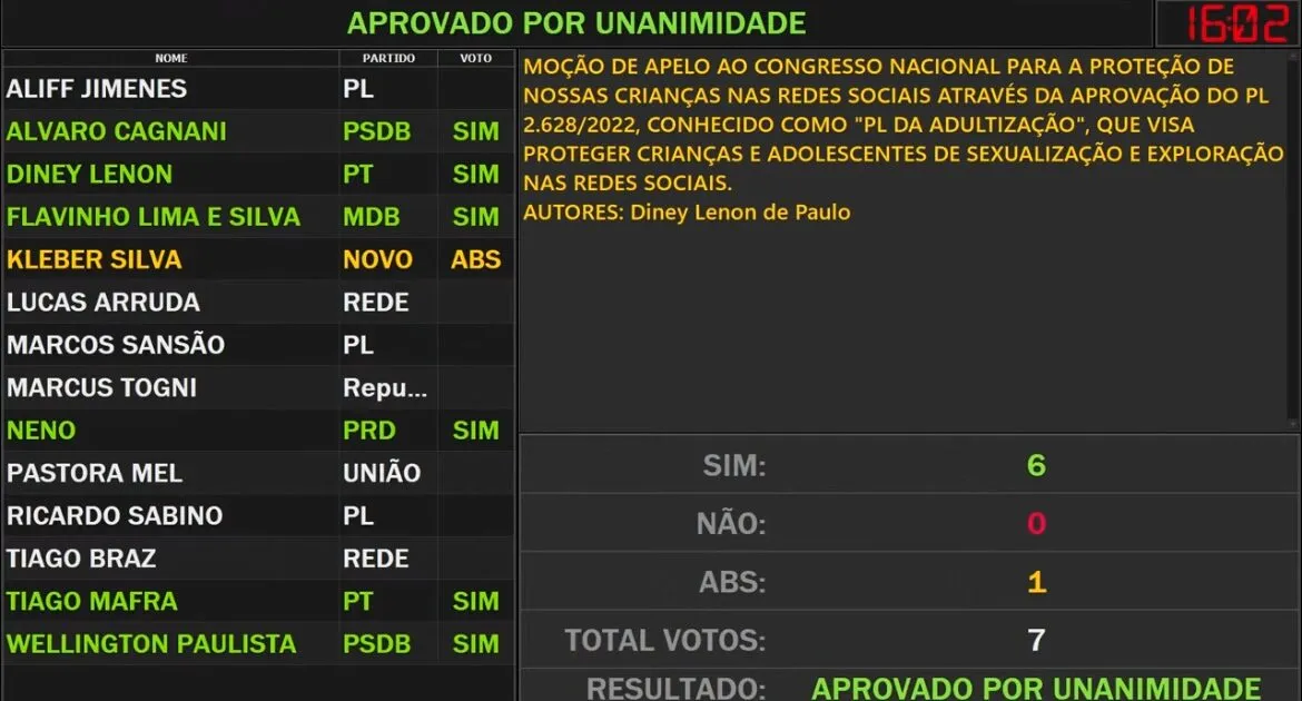 Na última terça-feira (19), a Câmara Municipal de Poços de Caldas aprovou uma moção de apelo ao Congresso Nacional para reforçar a proteção de crianças e adolescentes, por meio da aprovação do PL 2628 de 2022, conhecido como “PL da Adultização”. A proposta visa combater a sexualização e exploração de menores nas plataformas digitais. Dos 14 vereadores, 6 votaram a favor, 1 se absteve e nenhum votou contra.