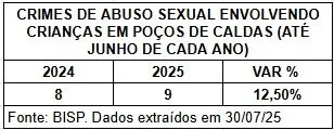 Poços de Caldas (MG) registrou crescimento nos casos de violência sexual contra crianças no primeiro semestre de 2025. De acordo com dados da Polícia Militar, o número de ocorrências cresceu 12,5% em relação ao mesmo período de 2024, passando de oito para nove casos. Apesar da variação numérica parecer pequena, os dados reforçam a gravidade do tema e acendem um alerta para o enfrentamento da violência sexual infantil no município.