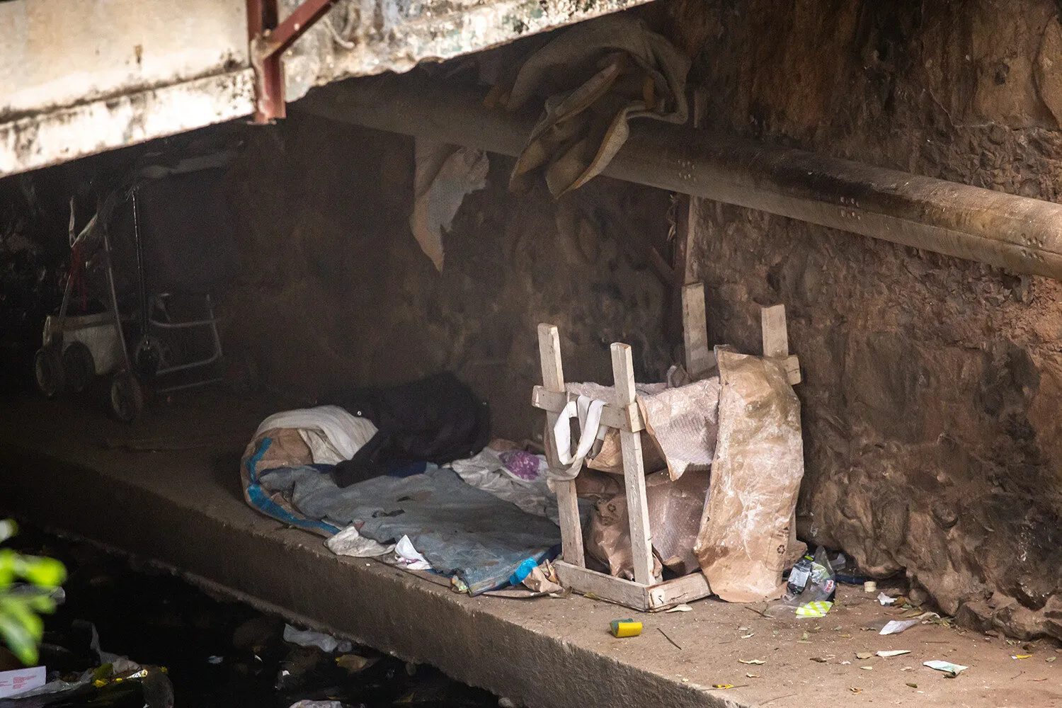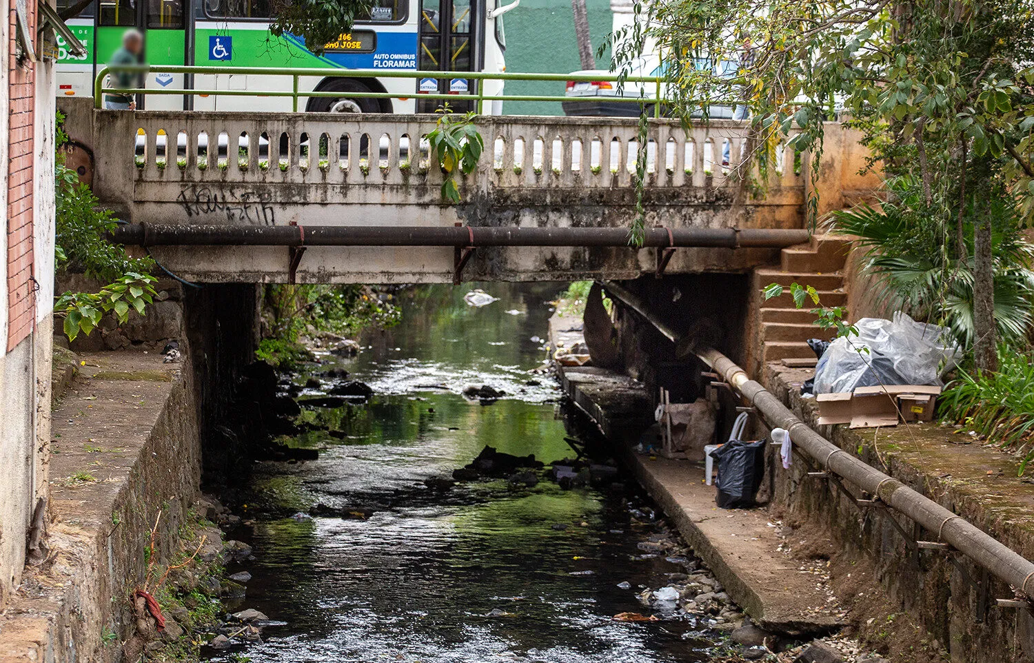 A ponte localizada na Praça Dom Pedro II, conhecida como Praça dos Macacos, no centro de Poços de Caldas, tem sido utilizada como abrigo por pessoas em situação de rua e apresenta acúmulo de lixo e entulho às margens do rio.