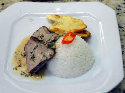 INGREDIENTES 1 ½ de contrafilé em uma só peça com gordura ½ xícara de chá de sálvia, tomilho e alecrim frescos picados 2 colheres de sopa de caldo de carne em pó ½ litro de água 1 cebola picada Sal a gosto PREPARO Tempere a carne somente com sal fino e frite em caçarola de fundo grosso até...