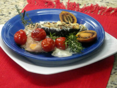INGREDIENTES 5 berinjelas médias 5 dentes de alho amassados 1 cebola picada 1 tomate grande picado 200 gr. de cogumelos frescos picados 10 fatias de mozarela Sal, azeite de oliva, salsinha e queijo parmesão a gosto PREPARO Corte as berinjelas ao meio no sentido do comprimento, retire os miolos com auxílio de uma colher de sobremesa e pique-os...