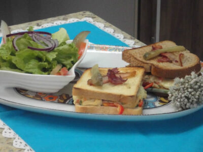 INGREDIENTES 1 pão de forma fatiado 600 gr. de peito de frango cozido e desfiado 1 tomate picado 1 tomate fatiado 1 cebola roxa em lâminas ½ pimentão vermelho em tiras 200 ml de requeijão cremoso (um copo) Sal, azeite de oliva, alho amassado, Cheiro verde, mozarela fatiada, bacon e picles a gosto PREPARO Refogue o recheio começando com...