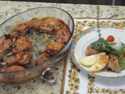 Frango assado com molho de peras