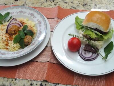 INGREDIENTES da massa 500 gr. de carne bovina moída 500 gr. de carne seca cozida e desfiada ½ xícara de chá de bacon picado e frito 3 ovos Sal, óleo de soja, azeite de oliva, salsinha e farinha de pão a gosto INGREDIENTES para a montagem 6 pães de hambúrguer Sal, mussarela, alface, maionese, tomate e cebola roxa...