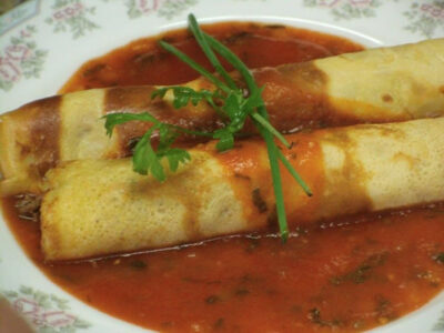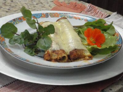 1 xícara de chá de farinha de trigo 2 ovos 2 xícaras de chá de leite 1 ½ xícaras de chá de grãos de milho verde 2 colheres de sopa de óleo de soja ½ litro de molho de tomate da sua preferência Sal a gosto INGREDIENTES do recheio 400 gr. de carne bovina moída 1 talo de alho...