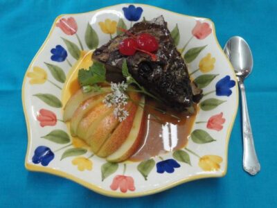 Bolo de chocolate com figos frescos e fio de ovos