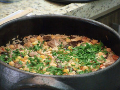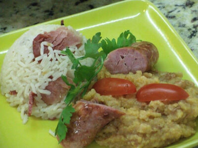 INGREDIENTES 2 xícaras de chá de arroz cru 1 xícara de chá de bacon laminado 4 xícaras de chá de água 1 cebola roxa cortada em cubos Sal, alho e óleo de soja a gosto. ACOMPANHAMENTOS Linguiça calabresa fresca Tutu de feijão PREPARO Frite o bacon no óleo até começar a dourar, junte o alho, a cebola roxa, o...