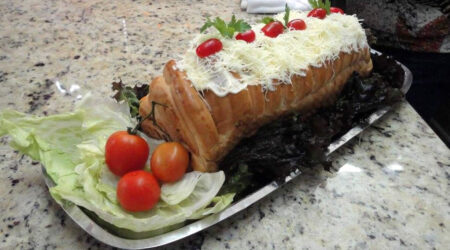 Cozinhe o lagarto em panela de pressão somente com água até amaciar, depois de cozido ele reduz pela metade e estará só com meio quilo. Retire da água, deixe gelar e com auxílio de uma faca afiada fatie o mais fino que conseguir.