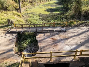 A estrutura foi danificada após um desabamento parcial ocorrido em dezembro de 2024, em razão das fortes chuvas que atingiram a cidade. Desde então, o trecho permanece interditado, com sinalização provisória e tráfego restrito.