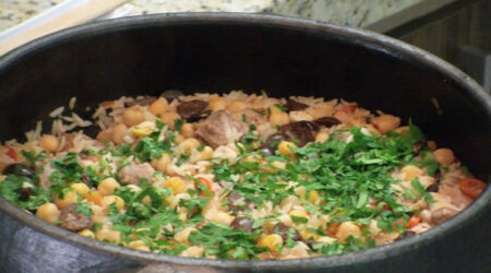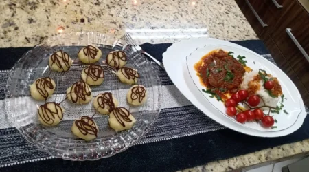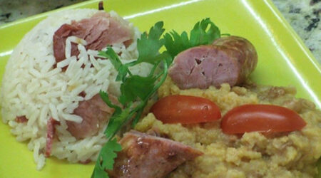 Em um refratário levemente untado com óleo, coloque metade do purê, a carne e cubra com o restante do purê.